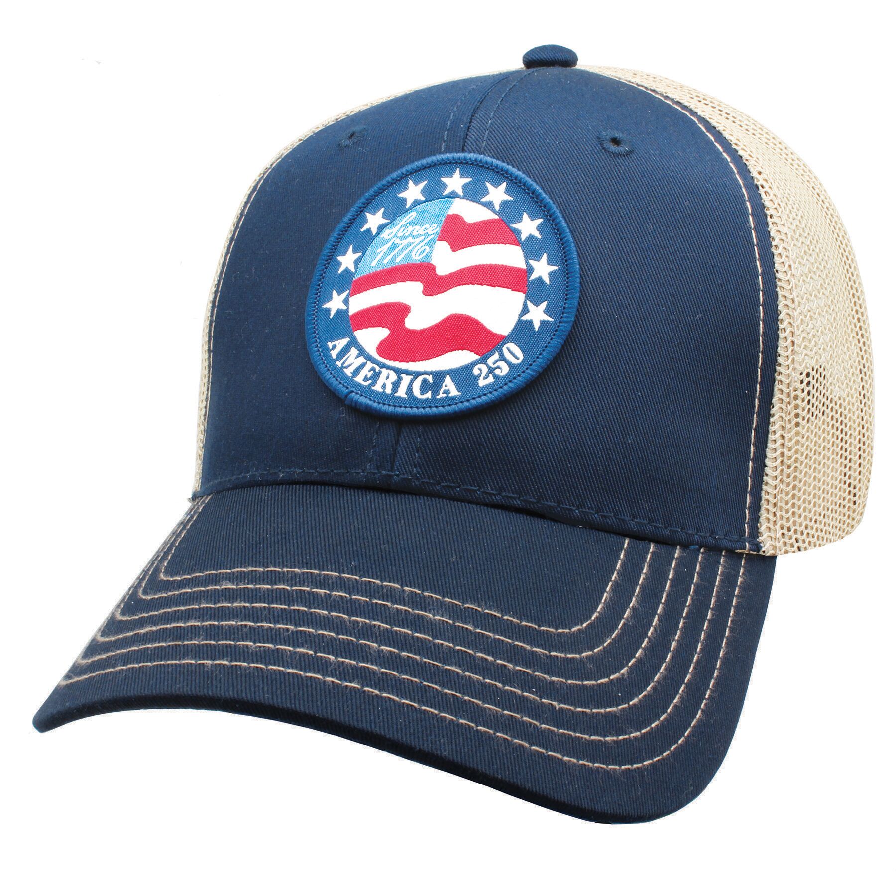 1776 woven flag hat. Celebrate the 250th anniversary of the United States with this Navy blue 6 panel mesh back low-fitting plastic snap back closure with a Woven patch with the text of “Since 1776 America 250”