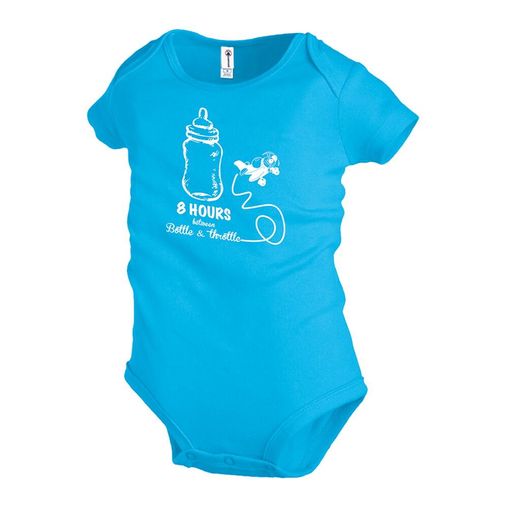 8 Hours Between Bottle and Throttle printed on a Lap shoulder 3 snap bottom closure. 100% cotton onsie. 6-18 month. KW-8ONE
