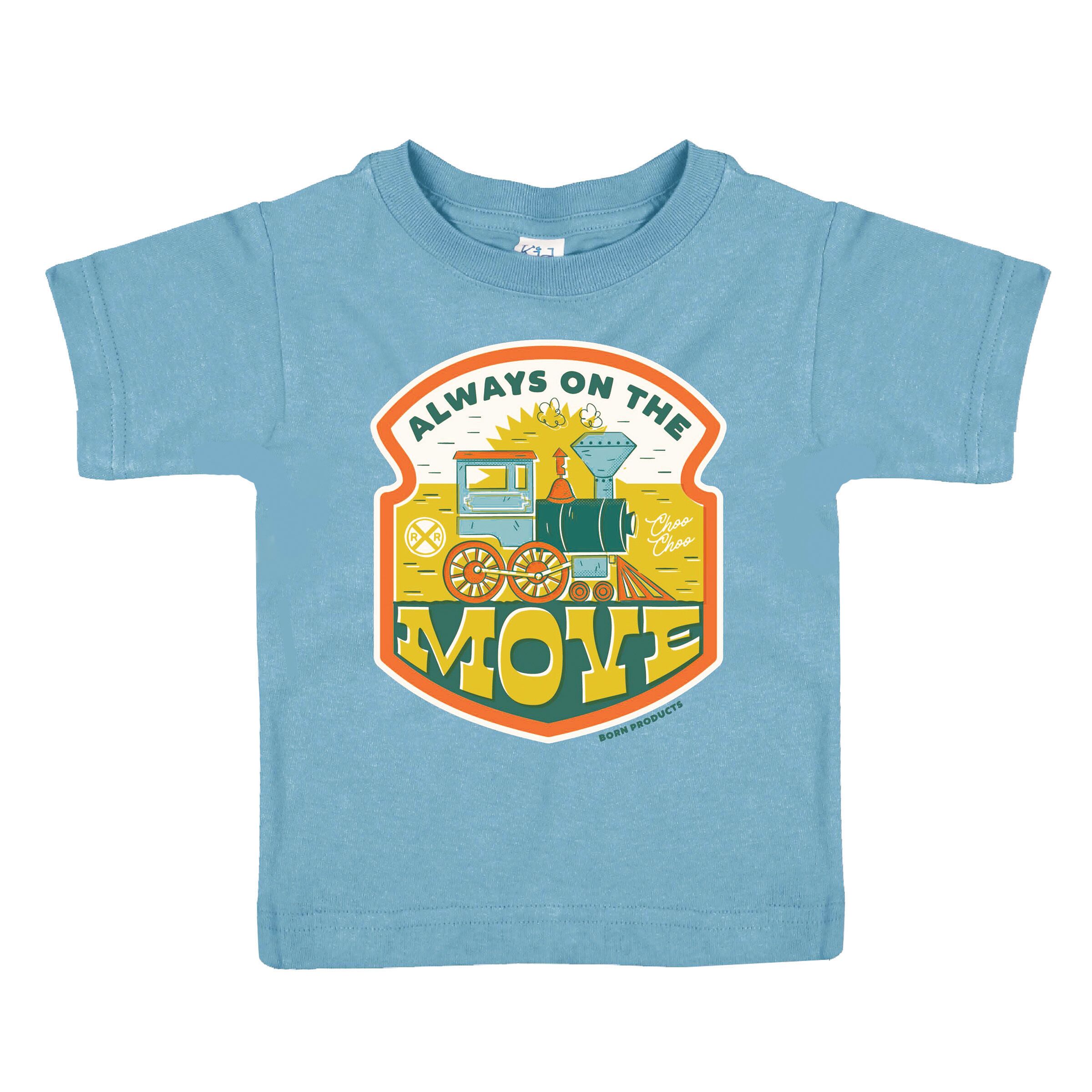 Steam engine with the text “Always on the move” printed on a 100% preshrunk sky blue toddler shirt. 2T-4T