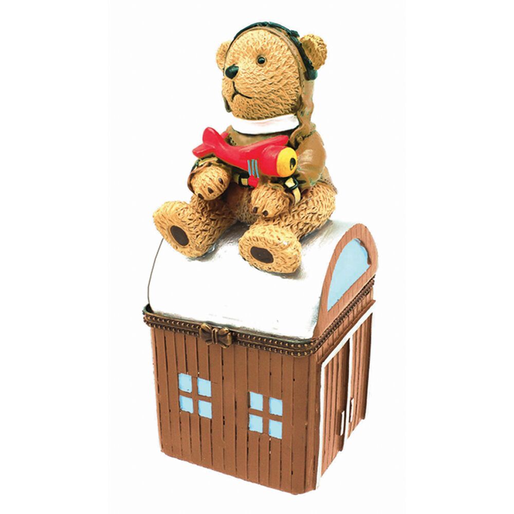 Cute little bear holding a airplane sitting on top of an old hanger. Sits 6 in. tall. AN-ATB