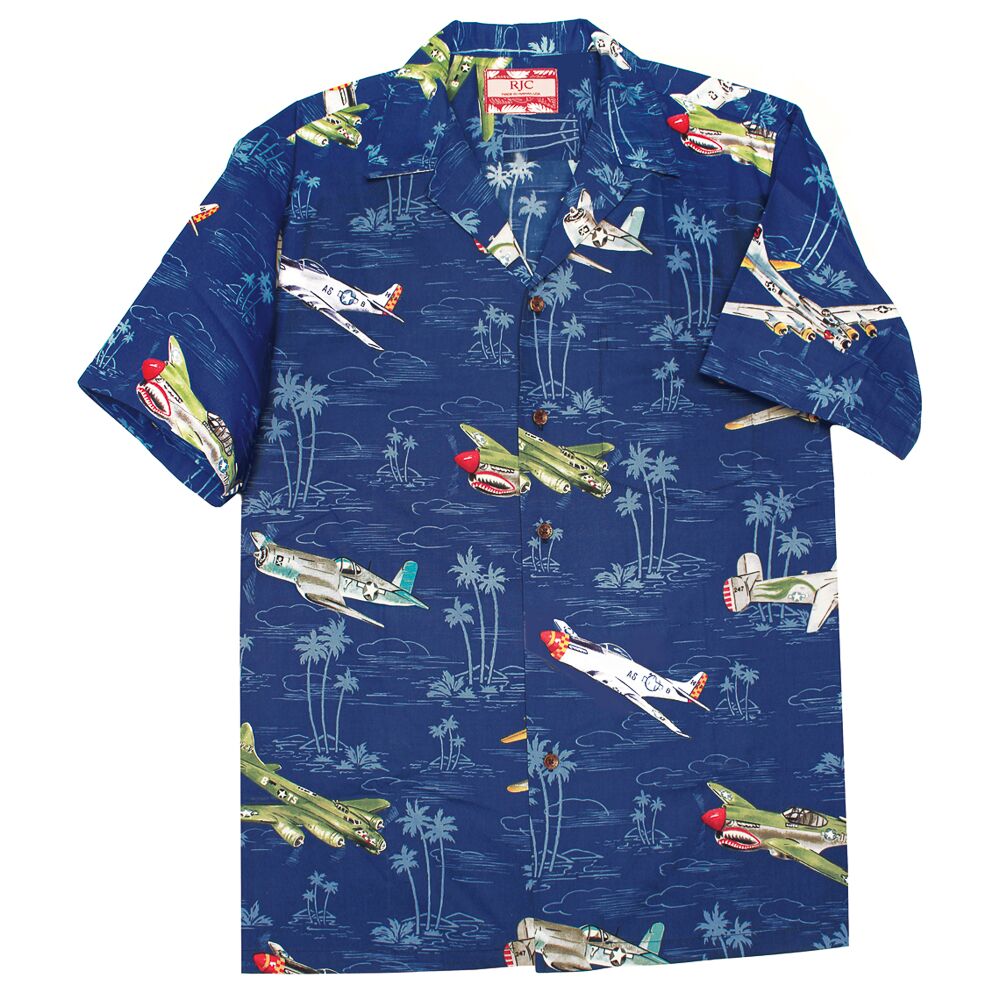 Hawaiian Aloha shirts with a aviation print worked into the tropical motif. We found these shirts on the Hawaiian Island of Oahu. as cool to wear as a tropical trade wind. WWII fighters and Bombers on a 100% cotton Navy blue. HS-BH