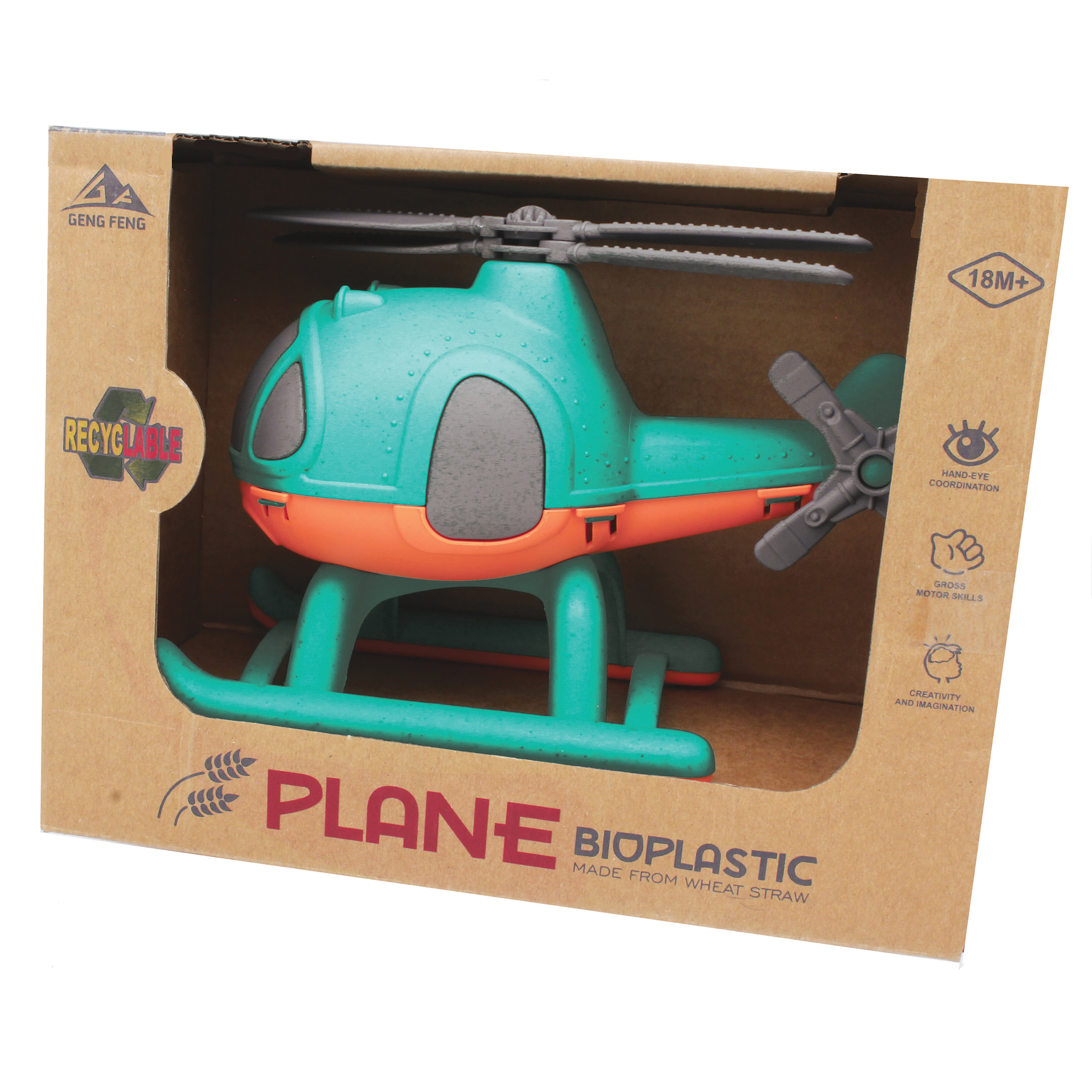 Boxed plastic helicopter.  Helicopter is free wheeling with blades that rotate. Made from eco-friendly wheat straw bioplastic. 7 1/2 x 4 x 5 1/2 inches. FM-BPH