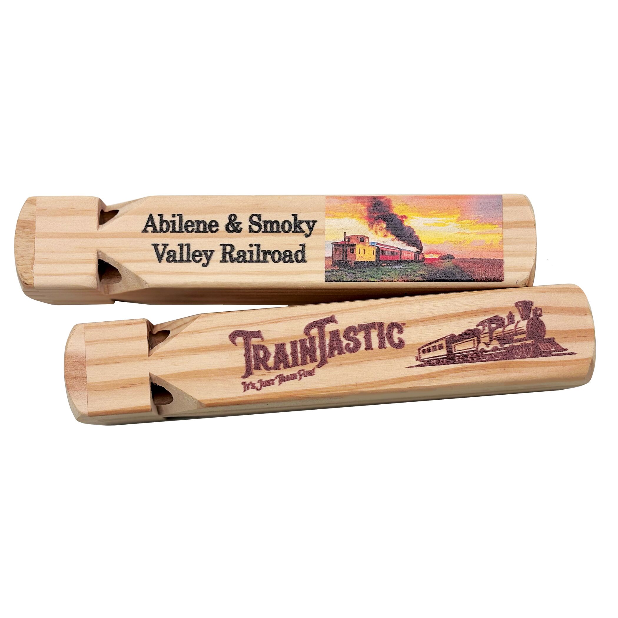 Custom UV printed whistle. Put your full color logo or image on our wooden train whistles. Full color image can be put on one side of a whistle with an 18 pc min order. A one time $25 art fee will apply. UV-CTW