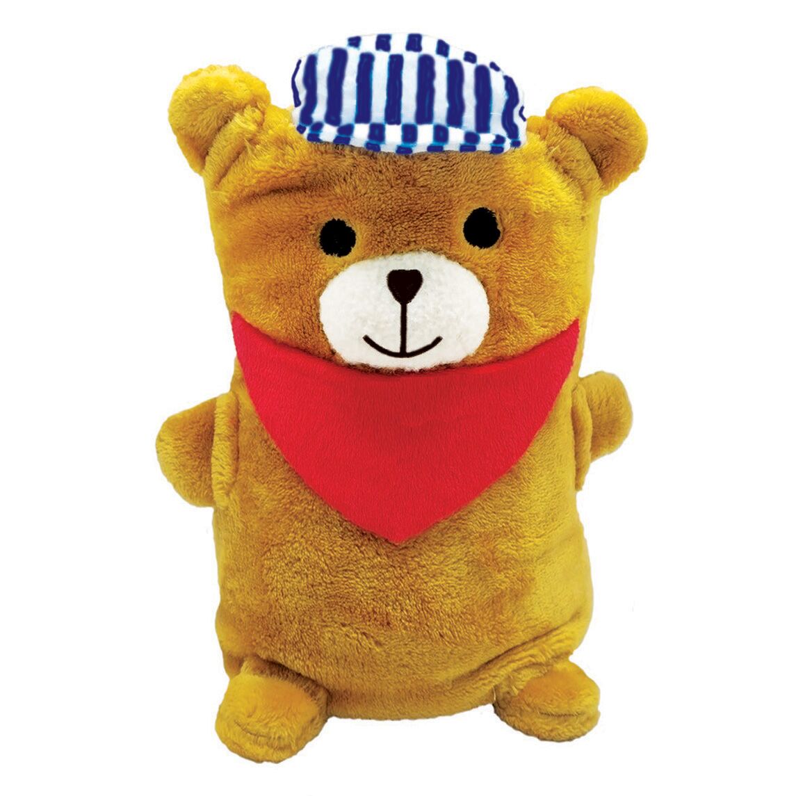 Engineer Bear blanket unrolls to 44 x 30 inches. When rolled up the Engineer Bear stands 10 inches. The Bear has a engineer hat and red scarf little arms and legs. Undo the strap in the back and the bear unrolls into a soft cuddly blanket. 1AN-EBB