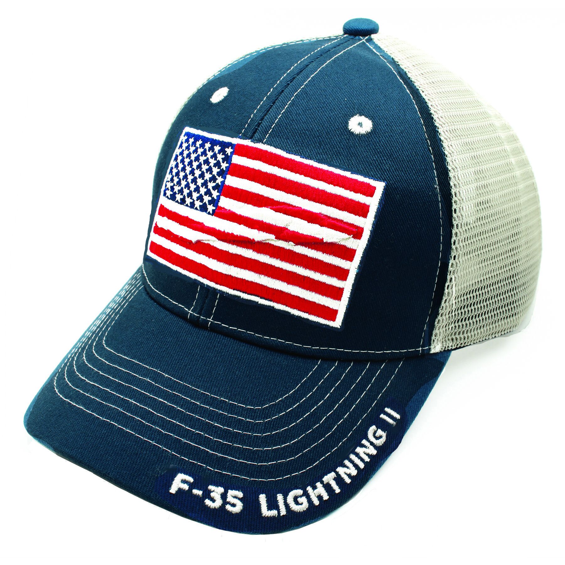 F-35 embroidered 3D hat. Embroidered American flag with the outline of a F-35 with a 3D raised silhouetted inside the flag. Navy blue bill and front of hat, off white mesh backing with navy snap back. HTE-3DF35