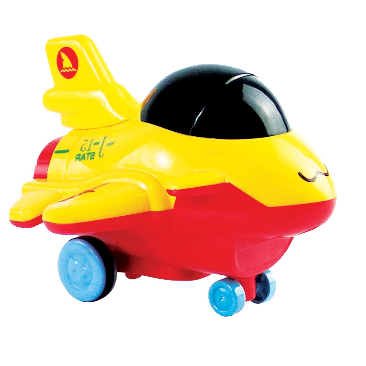 Friction powered multicolored toy airplane.