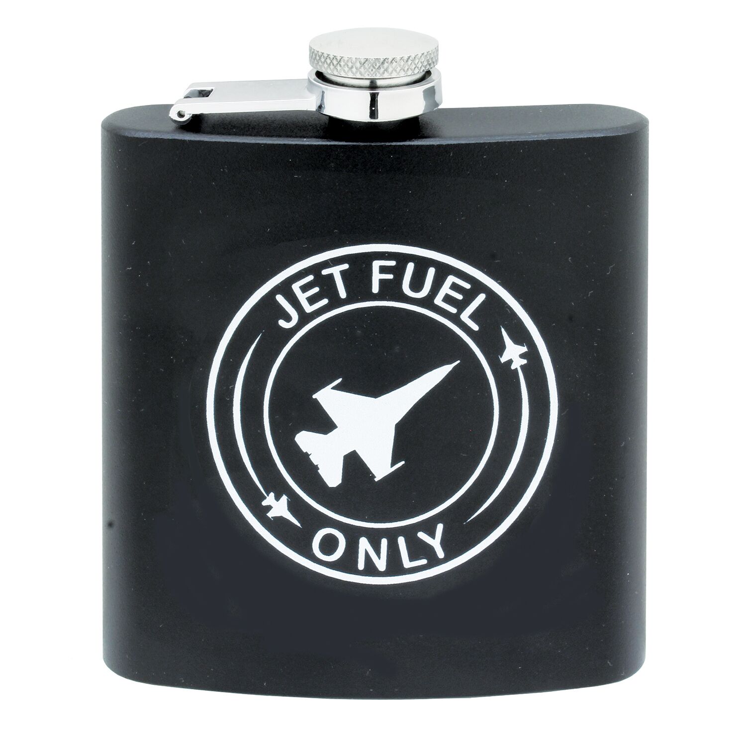 Jet Fuel Only flask. Jet Fuel only image on the front of a black 6 oz. flask. DW-JFOFL