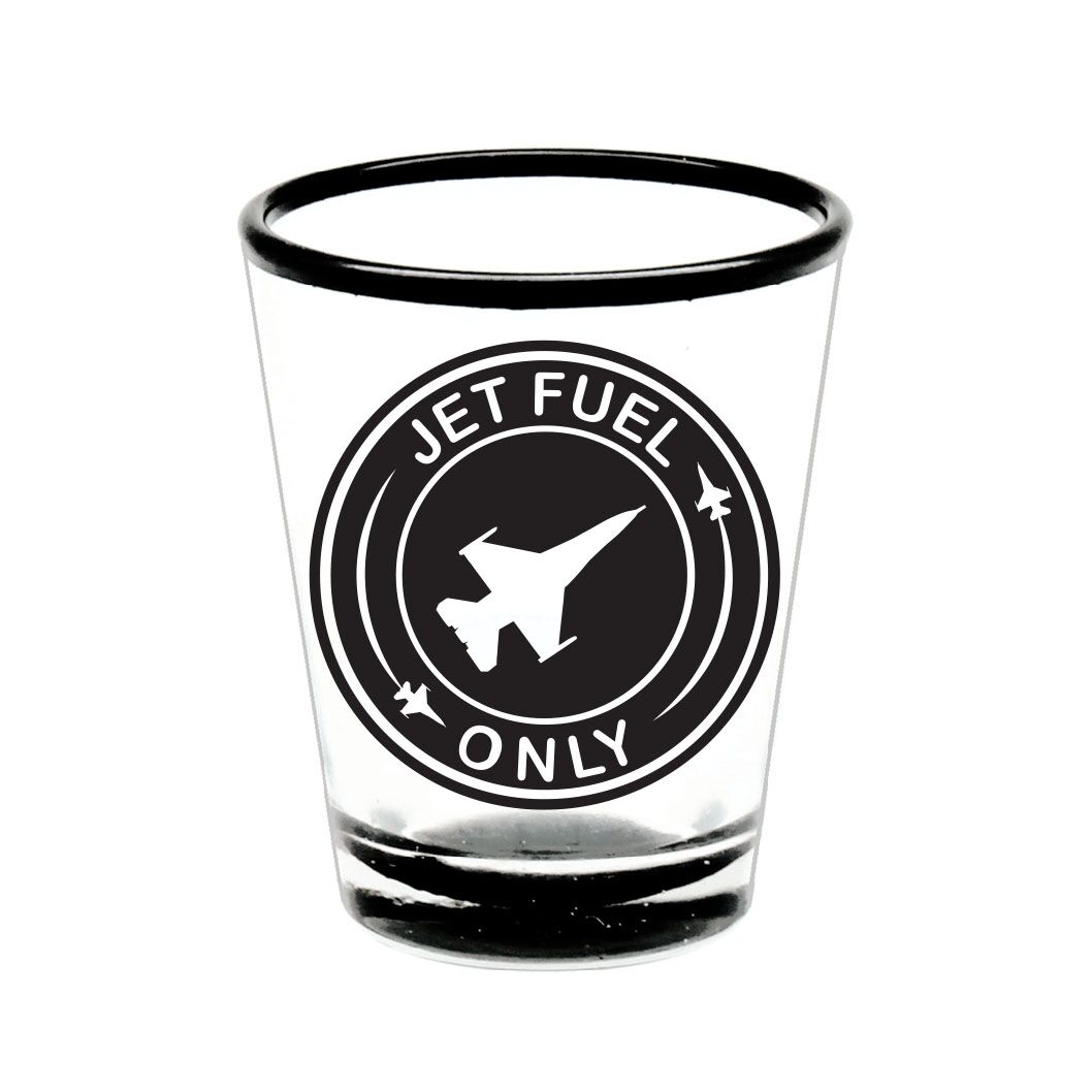 Jet fuel only shot glass. Image printed on a black rim and bottom glass shot glass. SG-JFO