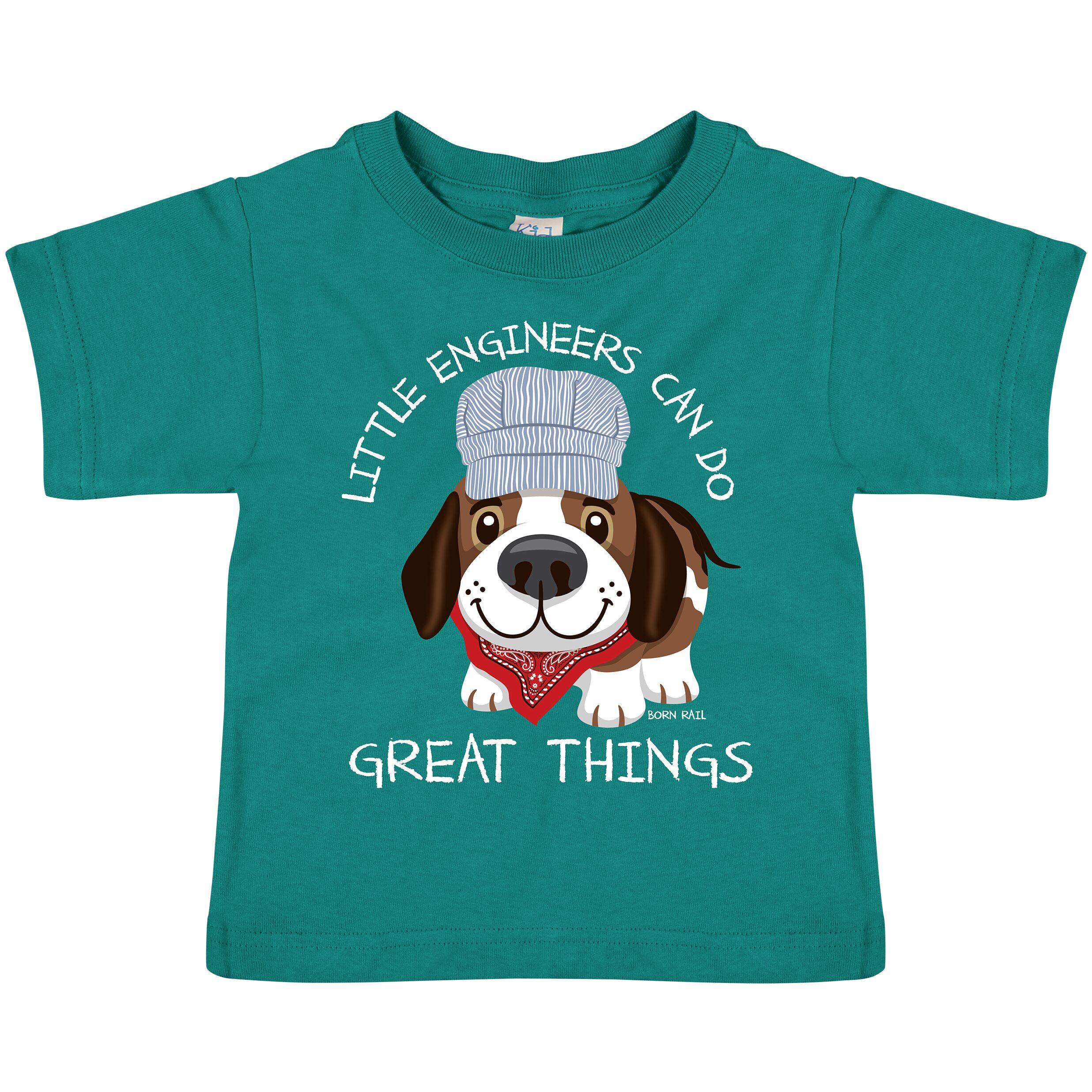 Dog dressed as an engineer with text “Little Engineers can do great things” printed on a jade toddler shirt. 1KW-LED