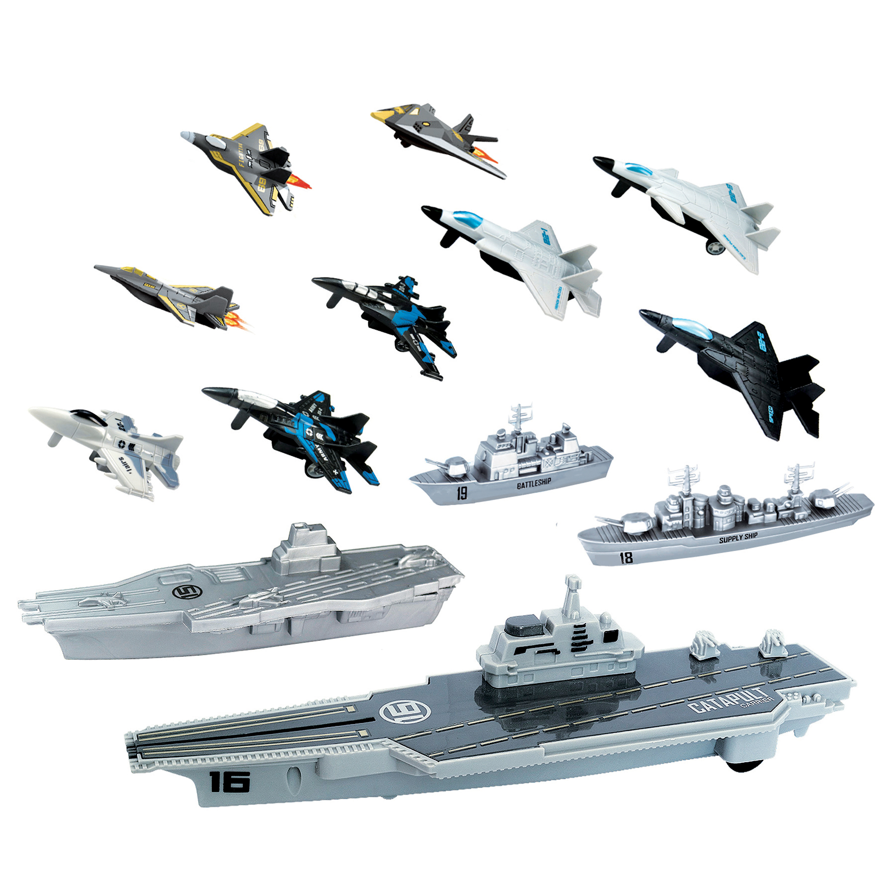 Navy play set. Set includes 9 airplanes and 4 ships. The large aircraft carrier spring launches airplanes. Large aircraft carrier is 10 x 2 1/2 x 3 inches. Display box shows off all the items in the box. FM-PSN