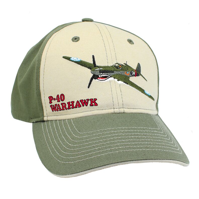P-40 embroidered hat. A Born Aviation Exclusive! Embroidered hats that are brushed cotton with contrasting sandwich bill, sewn eyelets, pre-curved bill and velcro closure.