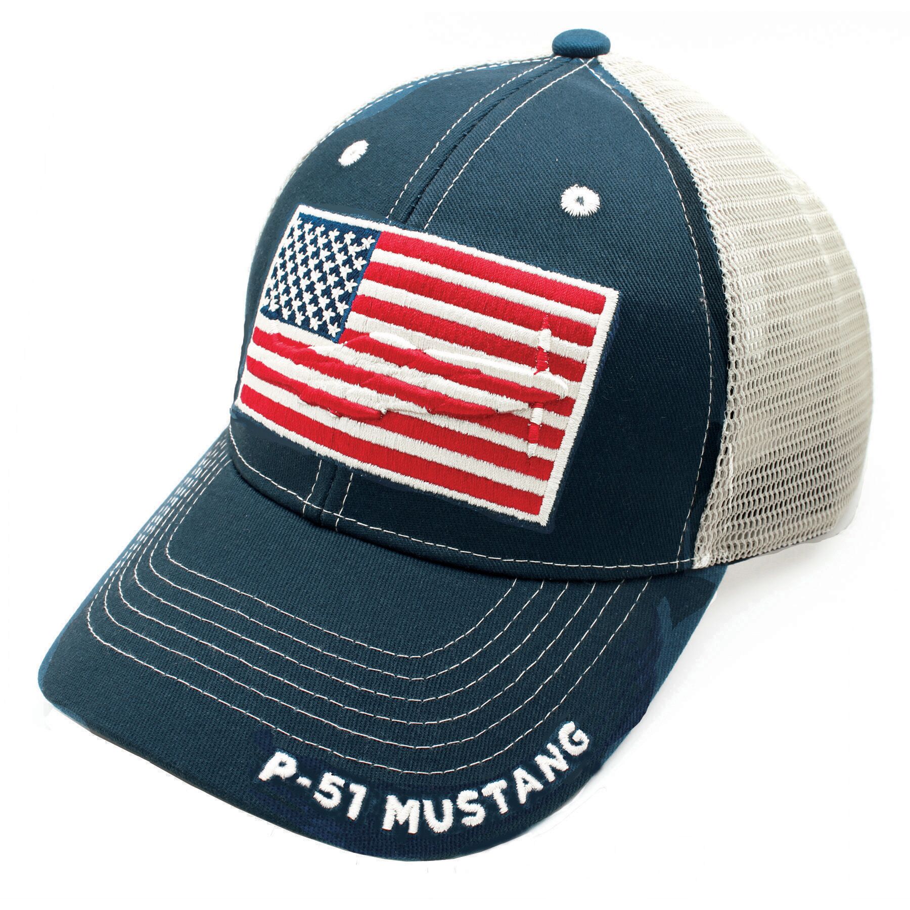 P-51 embroidered 3D hat. Embroidered American flag with the outline of a P-51 with a 3D raised silhouetted inside the flag. Navy blue bill and front of hat, off white mesh backing with navy snap back. HTE-3DP51