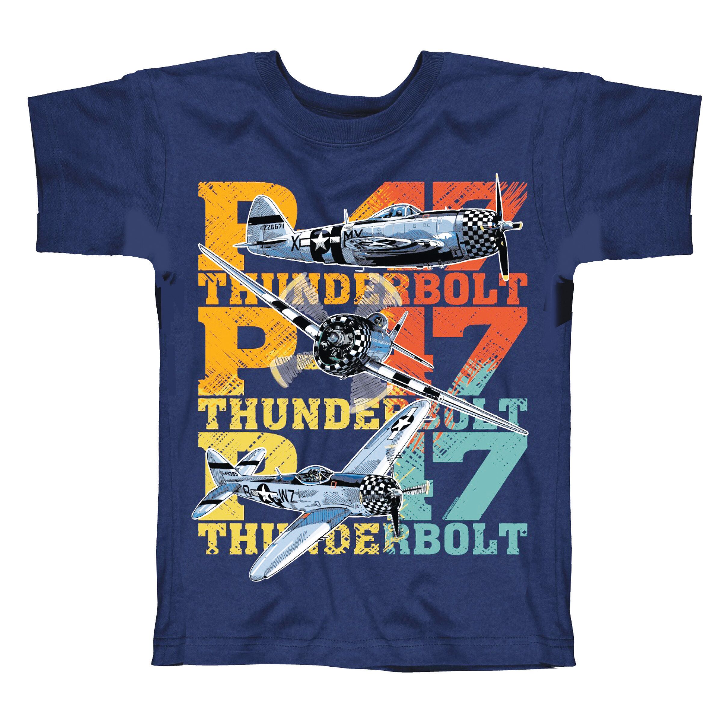 P-47 youth T-shirt. A brightly colored youth shirt with 3 different views of the P-47 printed over top of the text P-47 Thunderbolt. Printed on a 100% preshrunk cotton Navy youth shirt. XS-LG
