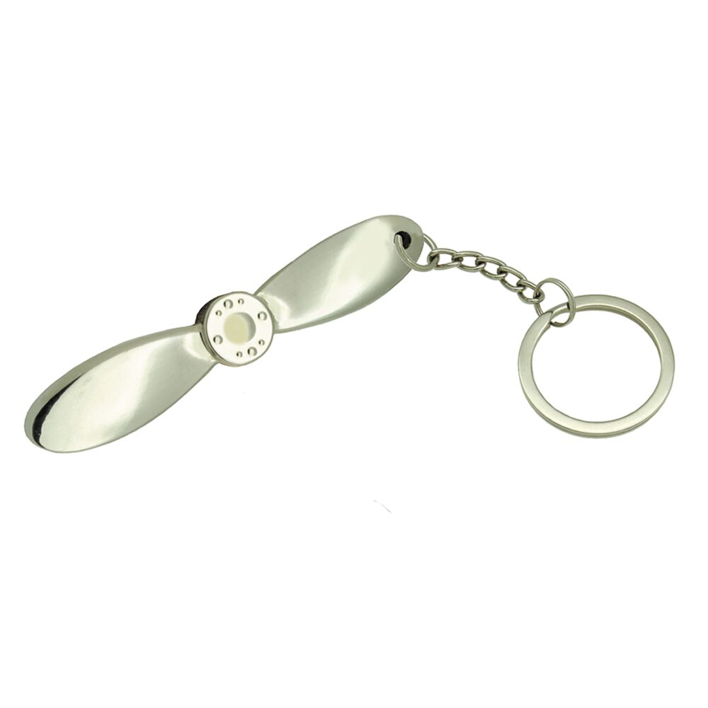 Key Chain shaped like a Propeller with a bottle opener on the bottom side. Chrome plated metal. 3 inches. KC-PBO