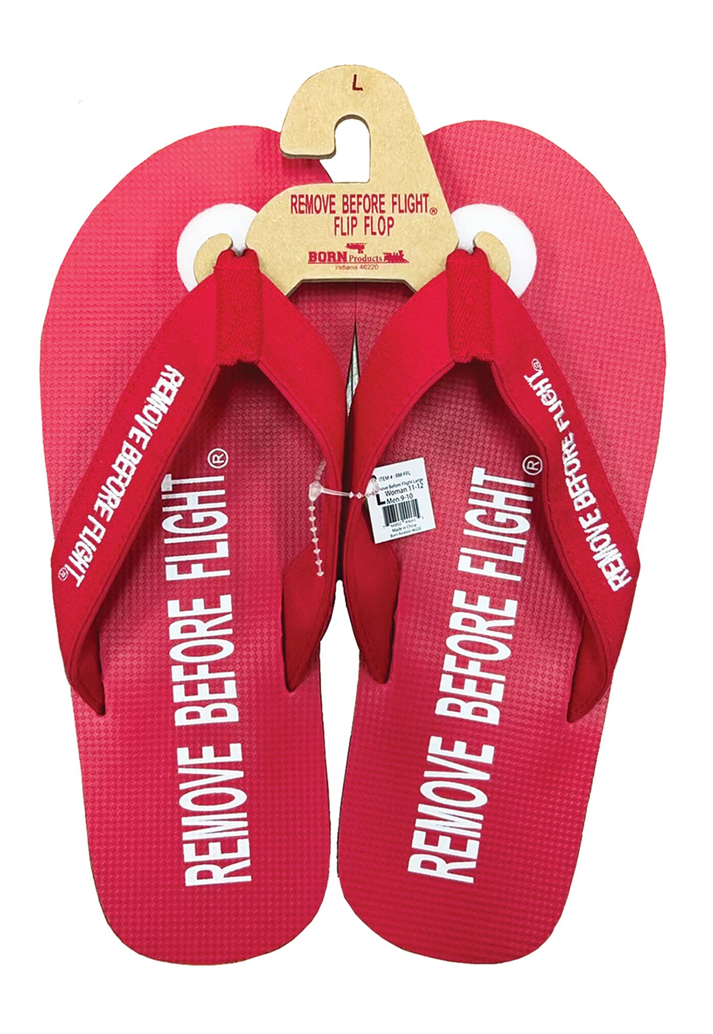 Remove Before Flight Flip Flops.  Try wearing these to the beach or out on the lake.  Flip flops with a cloth strap with “Remove Before Flight” embroidered on the strap.  Also the text is printed on the sole of the flip flops.  Comes in 4 sizes. S (Women’s 7-8, Men’s 5-6); M (W 9-10, M 7-8); LG (W 11-12, M 9-10); XL (W 13-14, M 11-12)