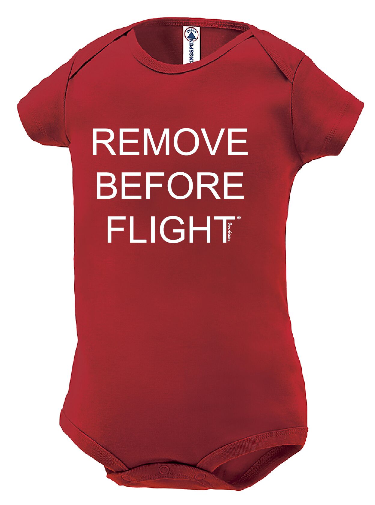 Remove Before Flight onesie 100% cotton, 3 snap.