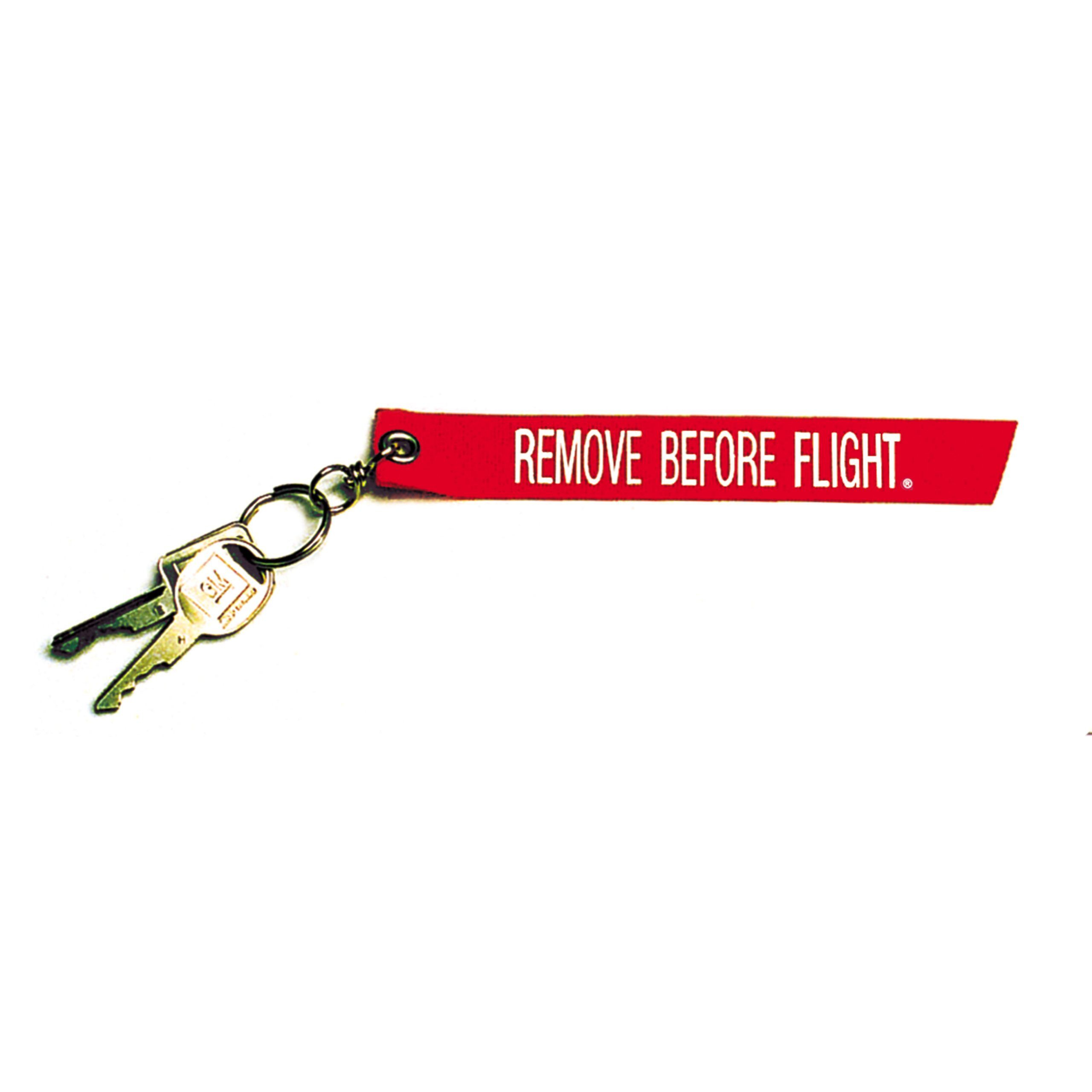 Remove Before Flight Ribbon key chain. Ribbon keychains silk-screened white on red. 6 in. KC-RM