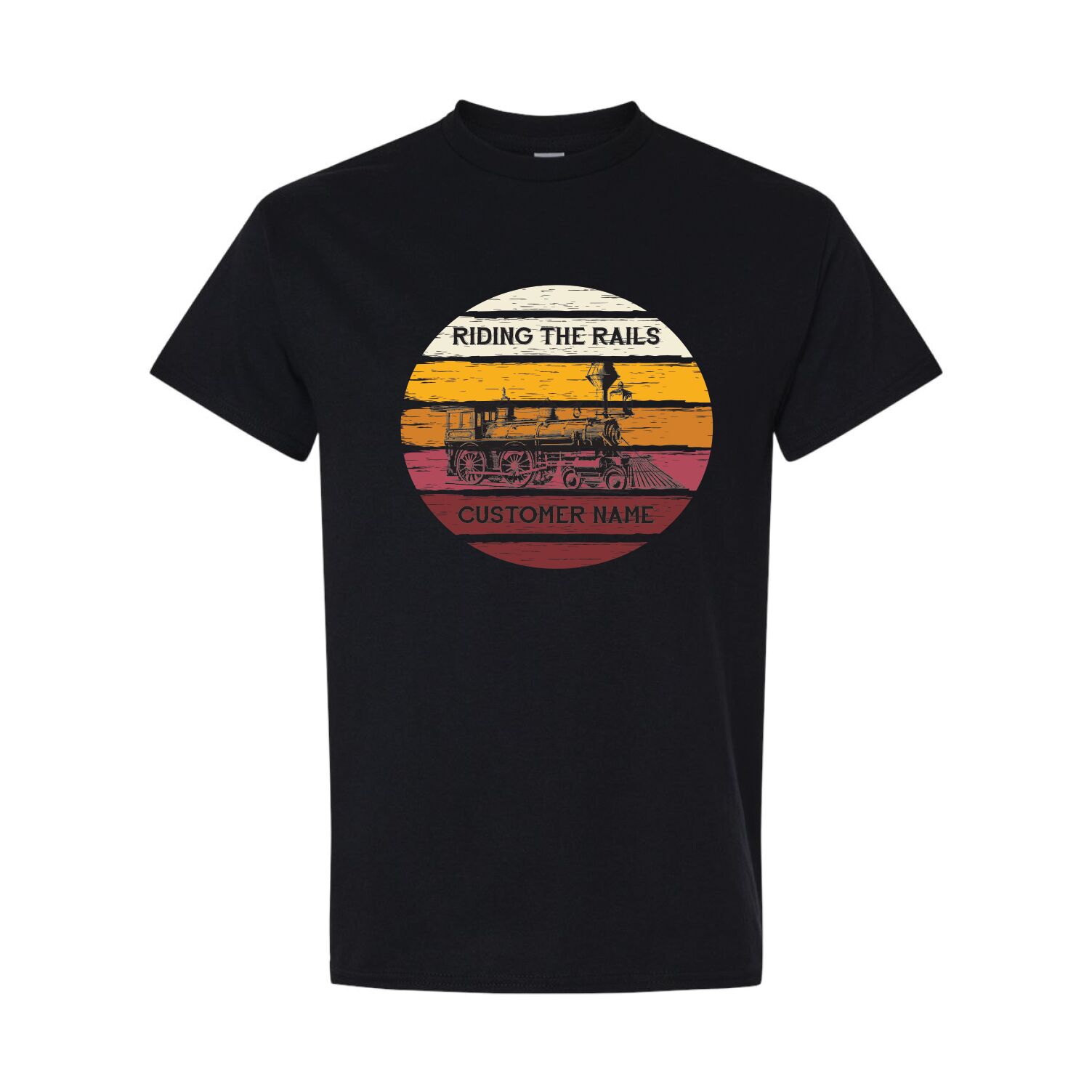 Riding the Rail custom T-shirt. Add your name to this colorful shirt. 48 pc min, mix sizes. Printed on black only. One time $25 art fee.