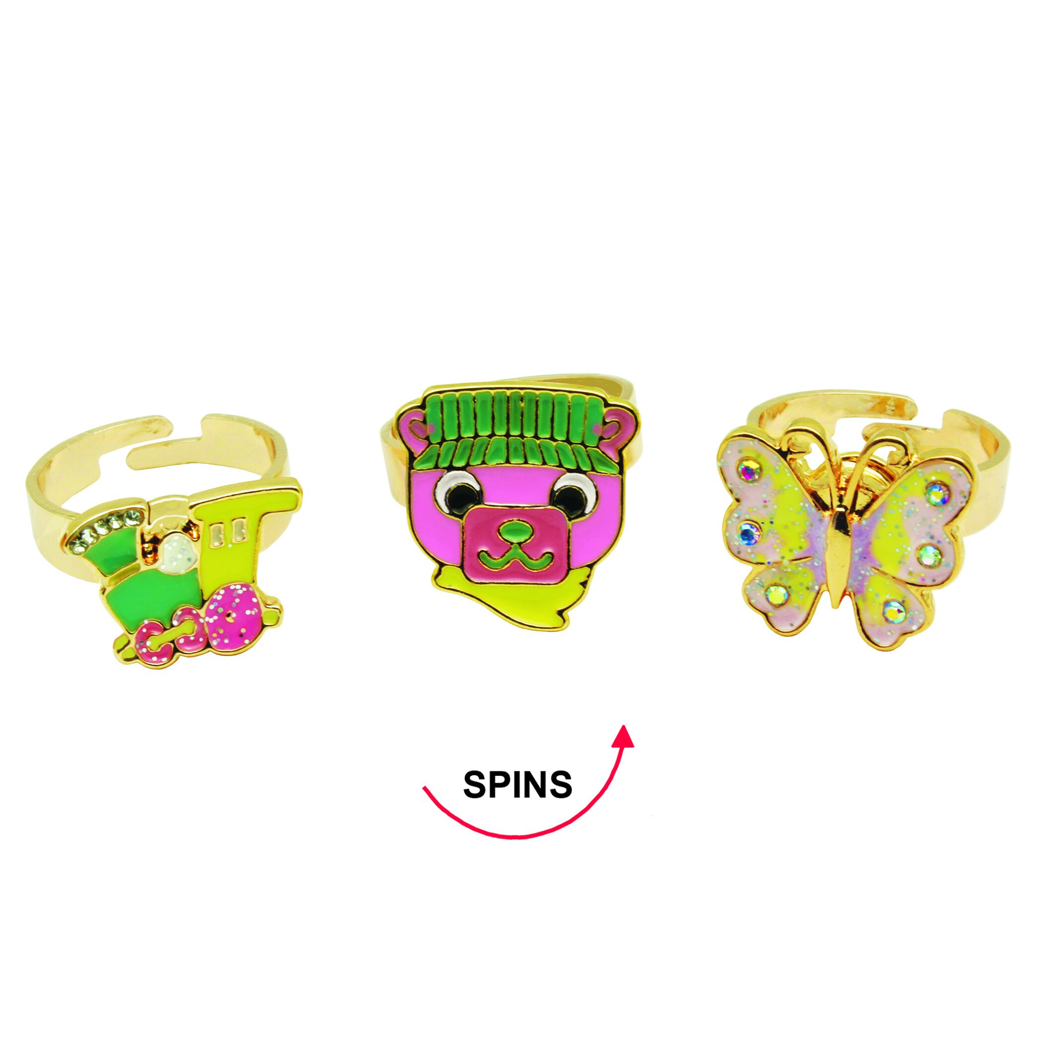 Spinning rail themed rings. These fun and brightly colored rings spin 360 degrees, face of ring will spin when moved. Display box with 25 Rail themed rings (18 rail themed and 7 fun and colorful rings). All rings are adjustable size. 1JR-SWT