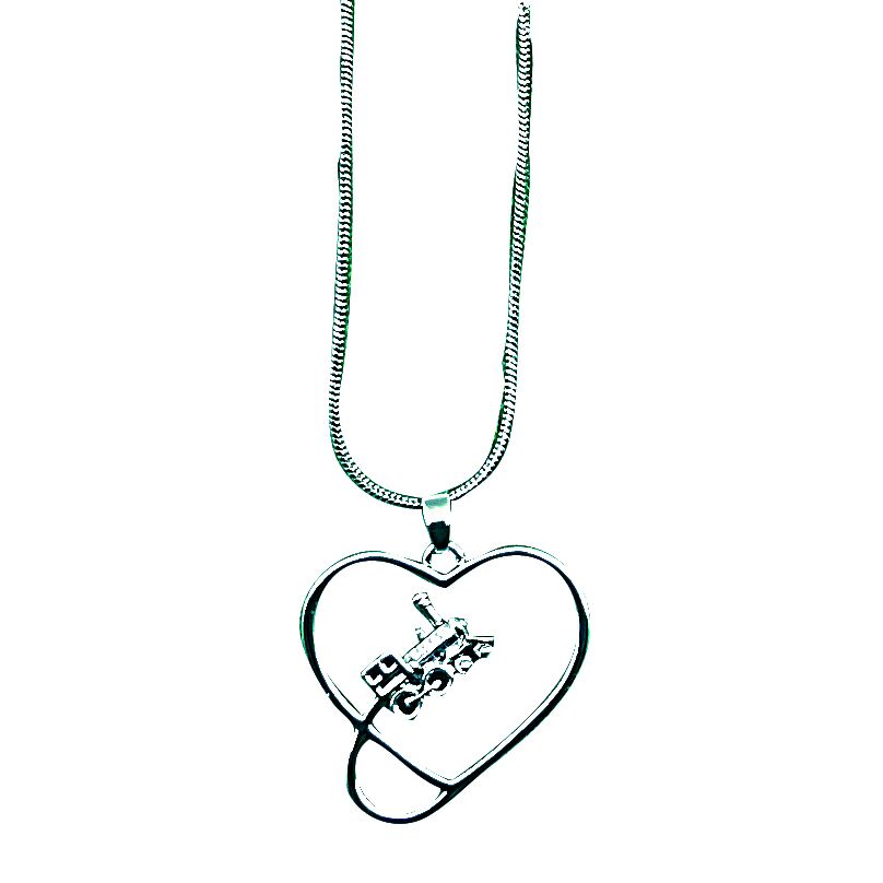 Steam train and heart necklace. Small steam train going through the center of a Heart. Silver finish with a rope chain.